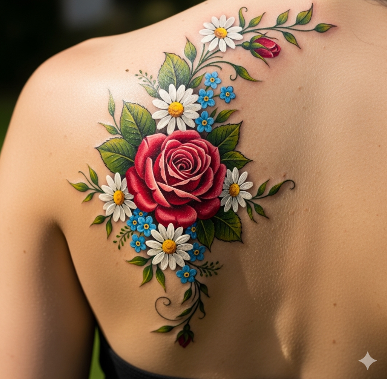 वृत्तचित्र चित्रण, अपनी जटिलताओं और जीवंत रंगों के साथ, आपके शरीर को एक जीवित कैनवास में बदल सकता है। हर फूल एक कहानी सुनाता है—शायद प्रेम या सहनशीलता का प्रतीक—जबकि डिज़ाइन की नरम वक्रता नारीत्व औरGrace के भावनाओं को जगाती है।
