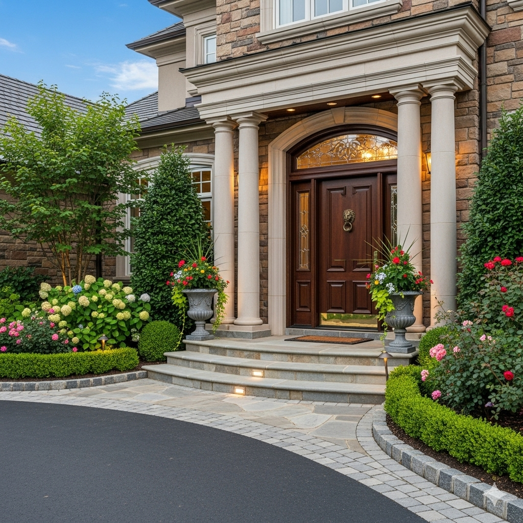 To elevate your curb appeal, consider a grand walkway lined with elegant landscaping. Choose rich materials like natural stone or pavers to craft a striking path that welcomes guests.
